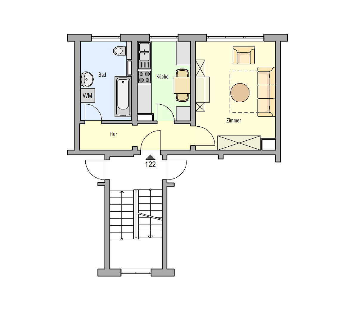 1 Raum Wohnung im 1.OG mit Tageslichtbad und Wanne, Kelleranteil und Stellplatz vorm Haus vorhanden