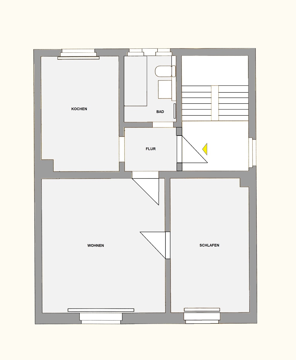 2 Raum Wohnung, PVC Belag, Bad gefliest, Wände Rauhfasertapete, weiß gestrichen, Tageslichtbad mit Wanne, zusätzliches Bodenzimmer, Kelleranteil, kleiner Schuppen im Garten für Fahrräder, etc., Gartenanteil, Stellplatz auf Grundstück